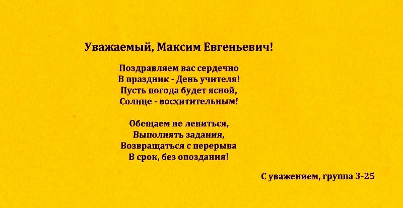 Мы спешим поздравить Вас с днем УЧИТЕЛЯ! Вы один из немногих преподавателей, к которым наша группа всегда с удовольствием ходила на пары, как жаль, что больше такой возможности нам не предоставится! :( Спасибо Вам, за Вашу доброту, искренность, благодаря Вам, жизнь в этом универе была не такой уж и пугающей! Долгих Вам лет жизни, умных и послушных студентов, таких как мы:)