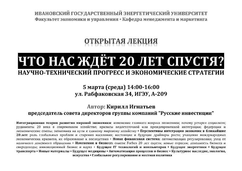 Приглашаем на лекцию «Что нас ждет 20 лет спустя?», 5 марта 14:00-16:00 (А-209)