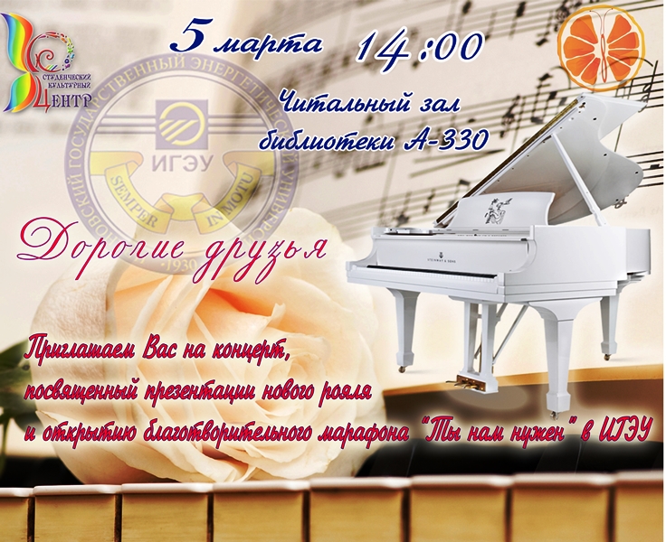 Приглашаем на концерт-презентацию нового рояля и открытие марафона "Ты нам нужен" в ИГЭУ, 5 марта в 14:00 (библиотека А-330)