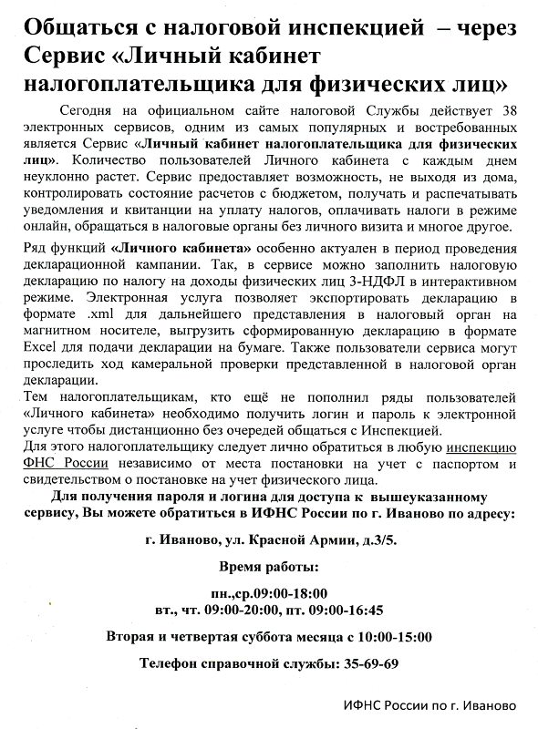 ИФНС России по г. Иваново: информация о "Личном кабинете налогоплательщика для физических лиц"