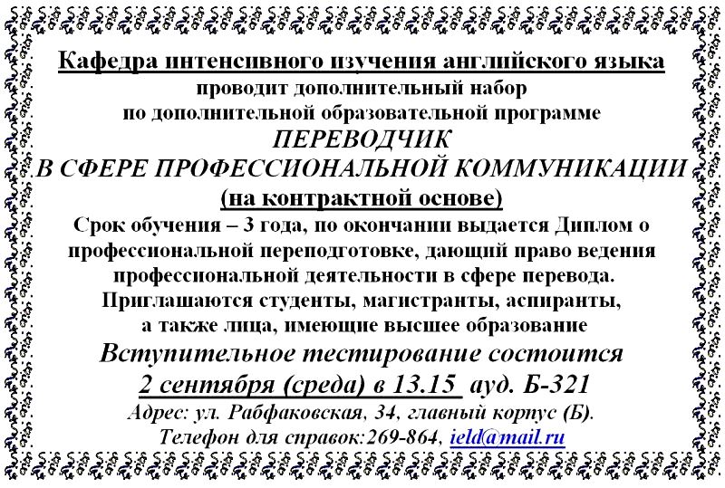 Объявлен дополнительный набор по программе "Переводчик в сфере профессиональной коммуникации" (тестирование 2 сентября 2015 г.)