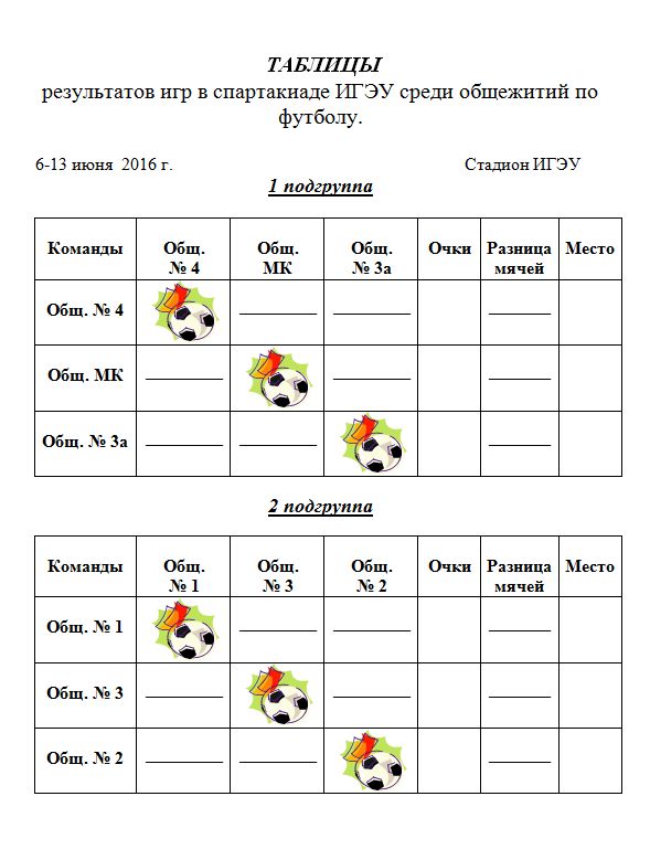 График и таблица игр спартакиады ИГЭУ среди общежитий по футболу, 14-17 июня 2016 г. (стадион)