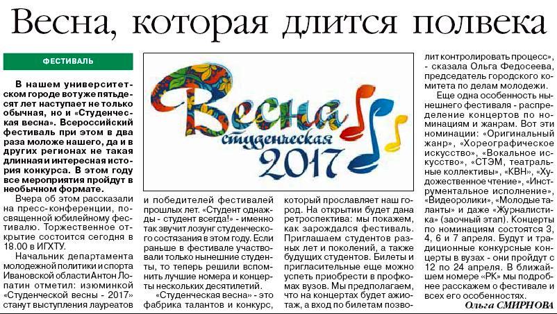 В преддверии открытия юбилейного, пятидесятого фестиваля вузов Ивановской области "Студенческая весна", в Ивановском Доме национальностей прошла пресс-конференция, посвященная этому событию. В ней приняли участие представители оргкомитета фестиваля: начальник Департамента молодежной политики и спорта Ивановской области Антон Лопатин, председатель комитета молодежной политики, физической культуры и спорта Администрации города Иванова Ольга Федосеева, председатель ИООООО "Российский Союз Молодежи" Дмитрий Чикунов и заместитель председателя Правления Ассоциации профсоюзных организаций студентов вузов Ивановской области Марина Вохмякова.