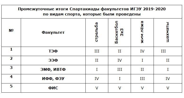 Спартакиада факультетов ИГЭУ 2019-2020, к сожалению, не завершилась из-за начавшейся пандемии, были проведены соревнования только по 4 видам спорта из 10 запланированных (жим лёжа, баскетбол 3х3, шахматы и стрельба из пневматической винтовки). Ограничимся промежуточными итогами соревнований, так как окончательные результаты Спартакиады будут не объективными и несправедливыми.