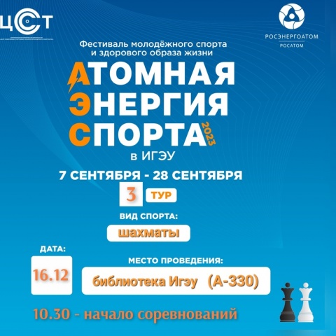 Приглашаем на шахматный блицтурнир Фестиваля «Атомная Энергия Спорта», 16 декабря 2023 г. в 10:30 (А-330)